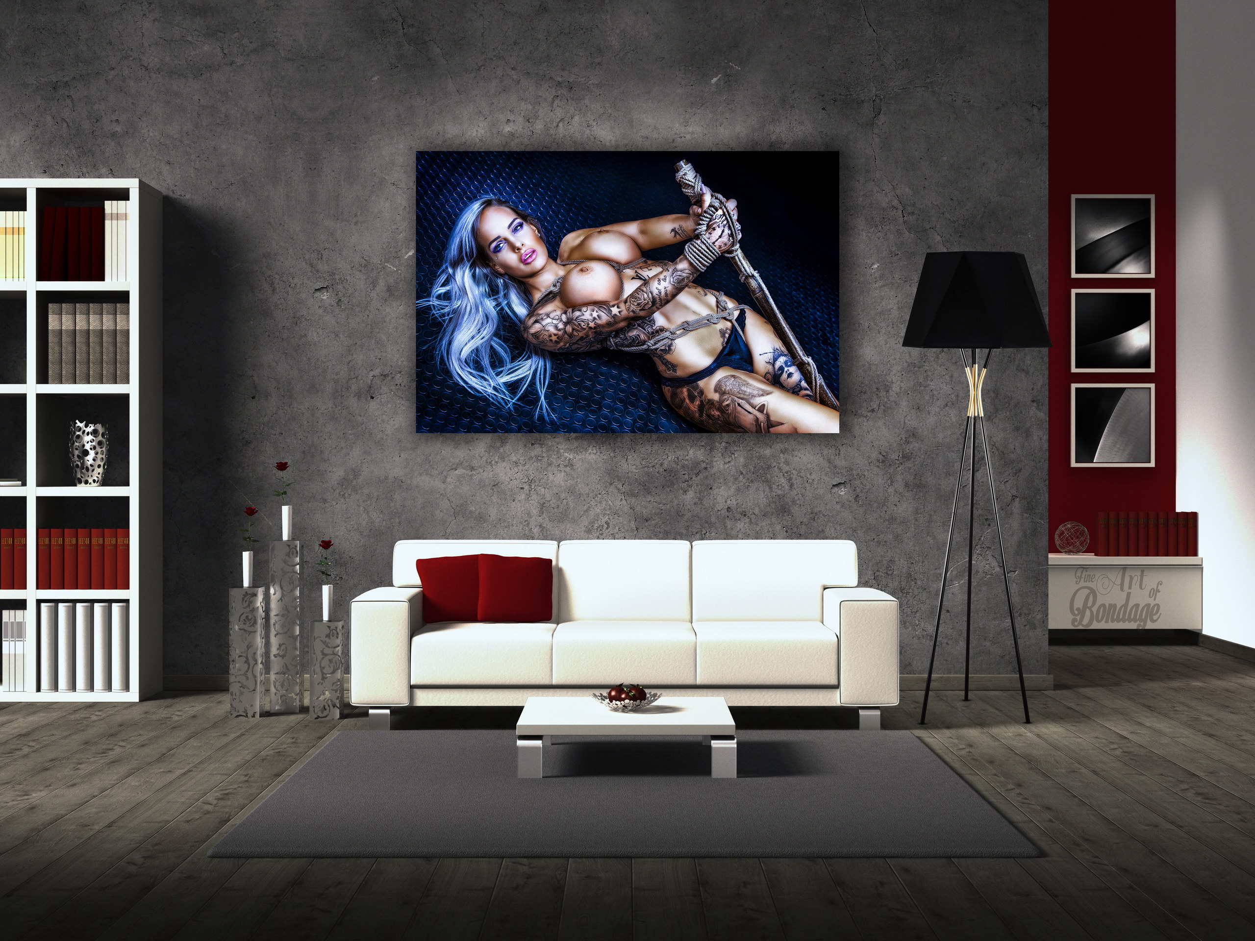 The image is from the "Fine Art of Bondage" photography project. Artful photography with highly retouched images in a very colorful and high contrast.