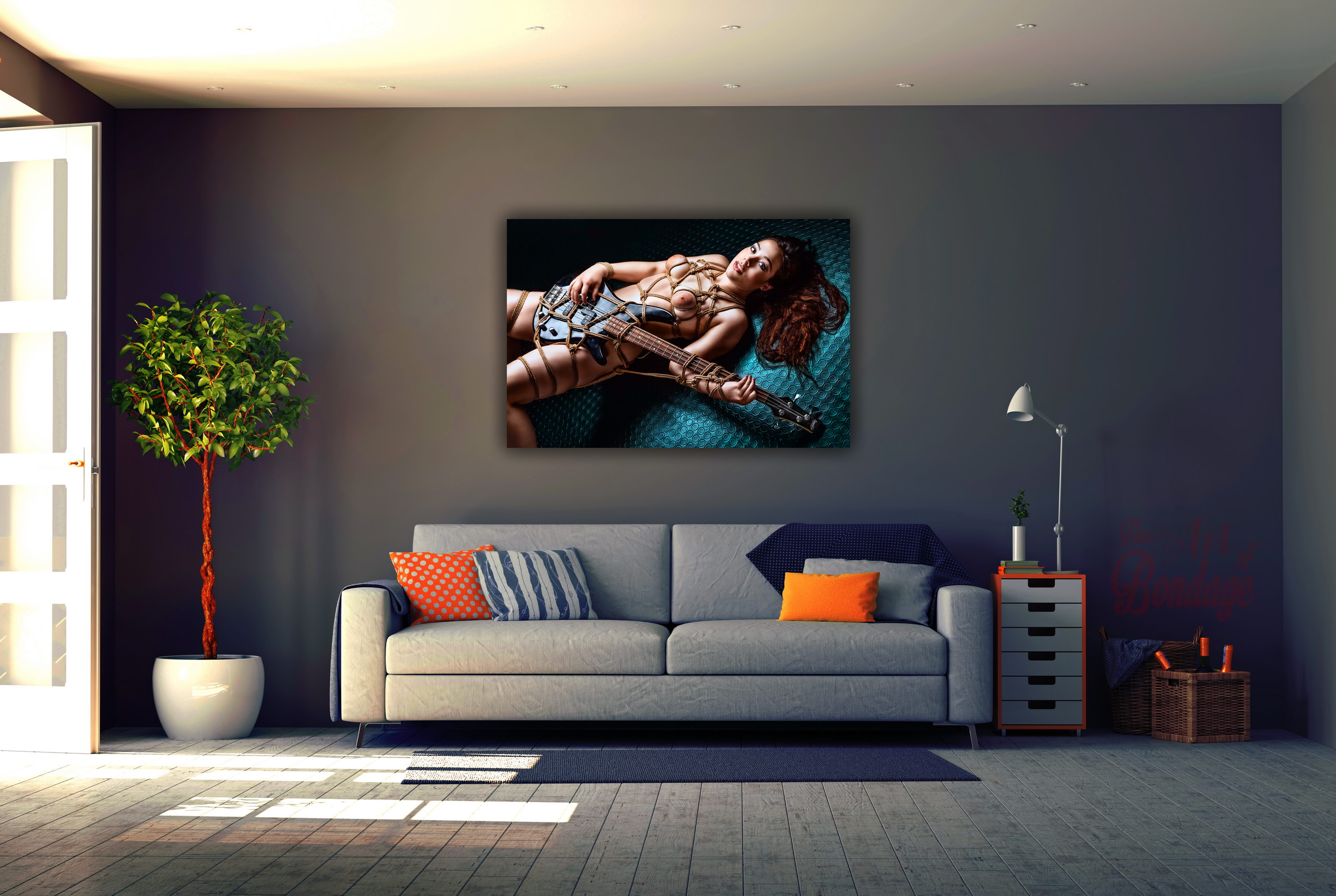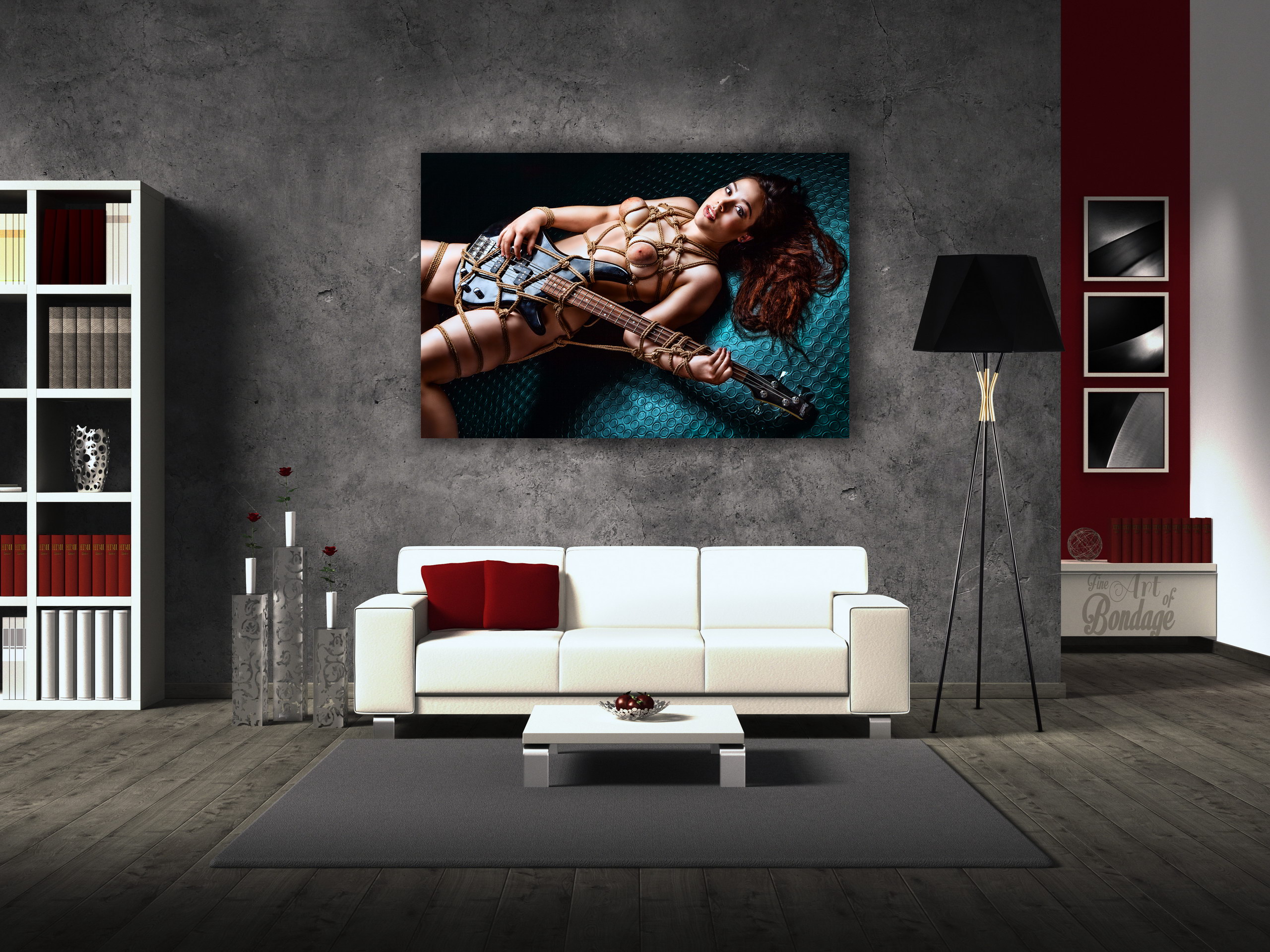 Bass Guitar, Tied Up - A bass guitar and a girl in a rope harness, lying/playing on the floor.... more