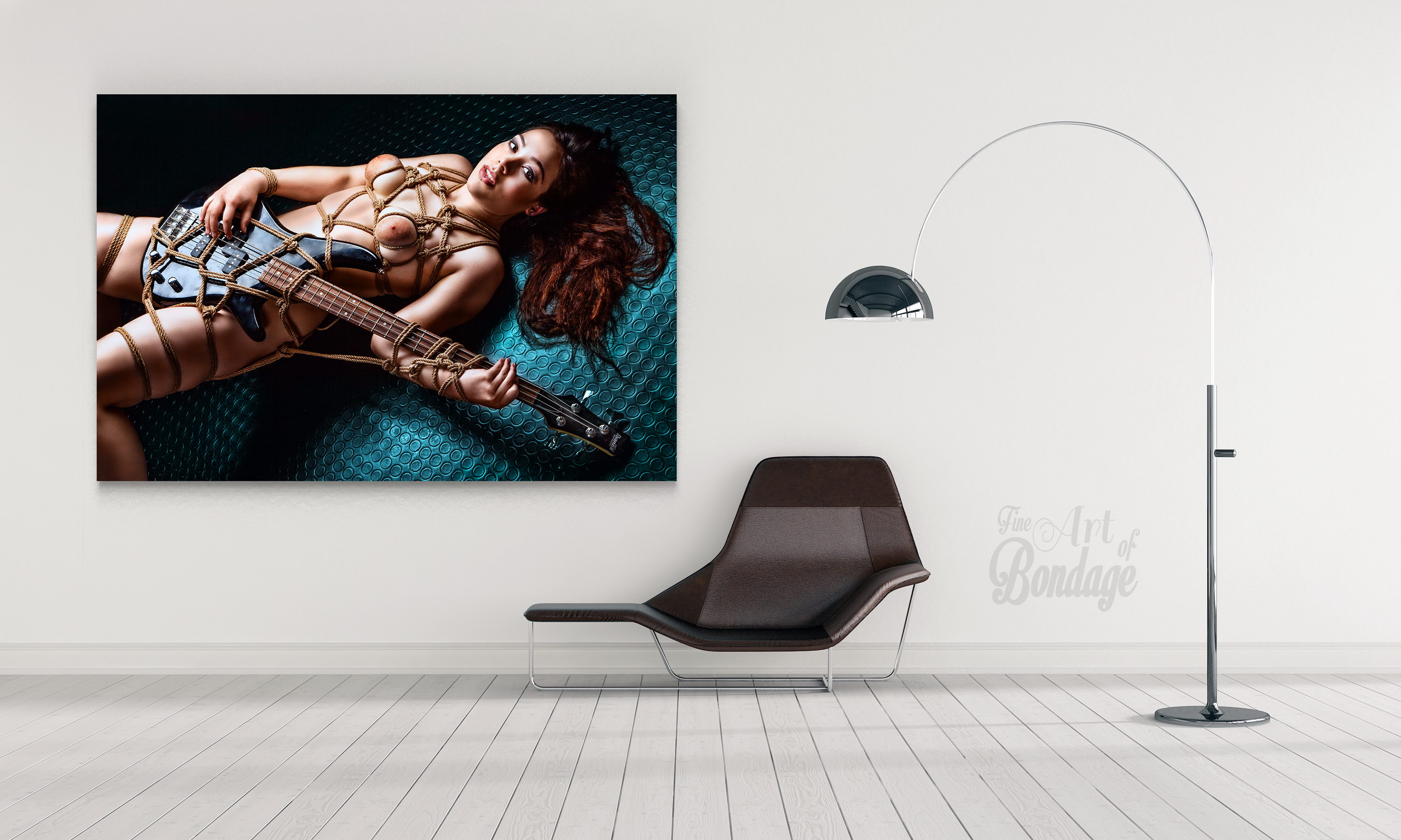 Bass Guitar, Tied Up - A bass guitar and a girl in a rope harness, lying/playing on the floor.