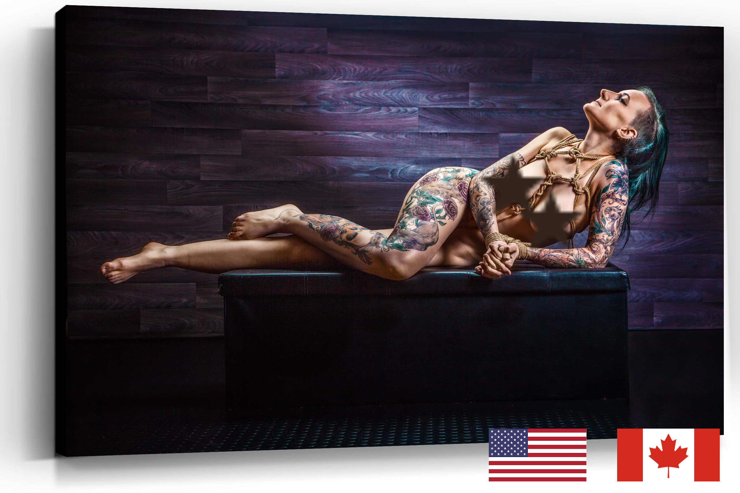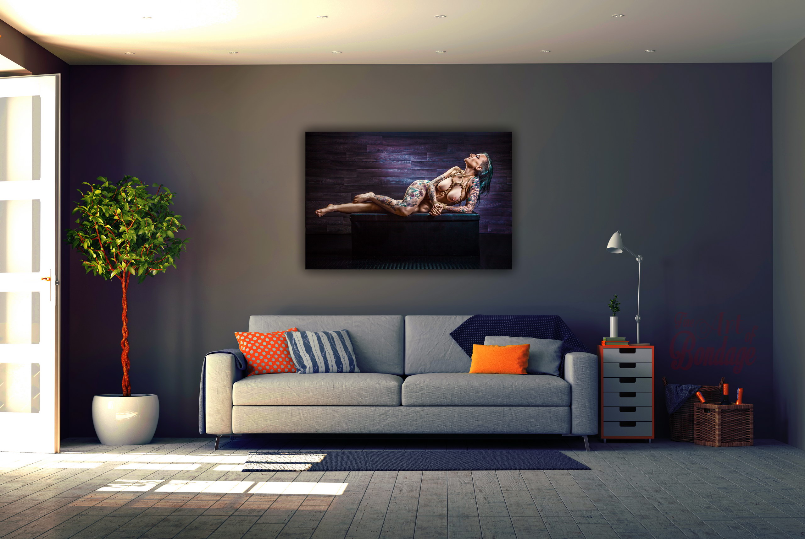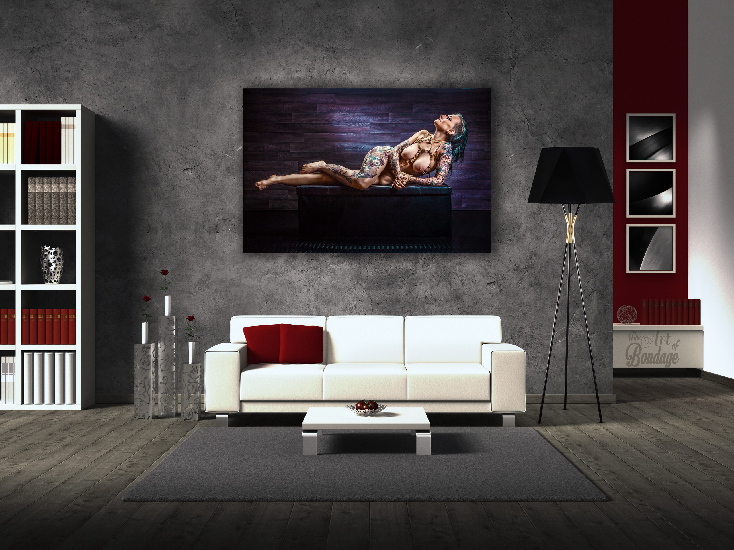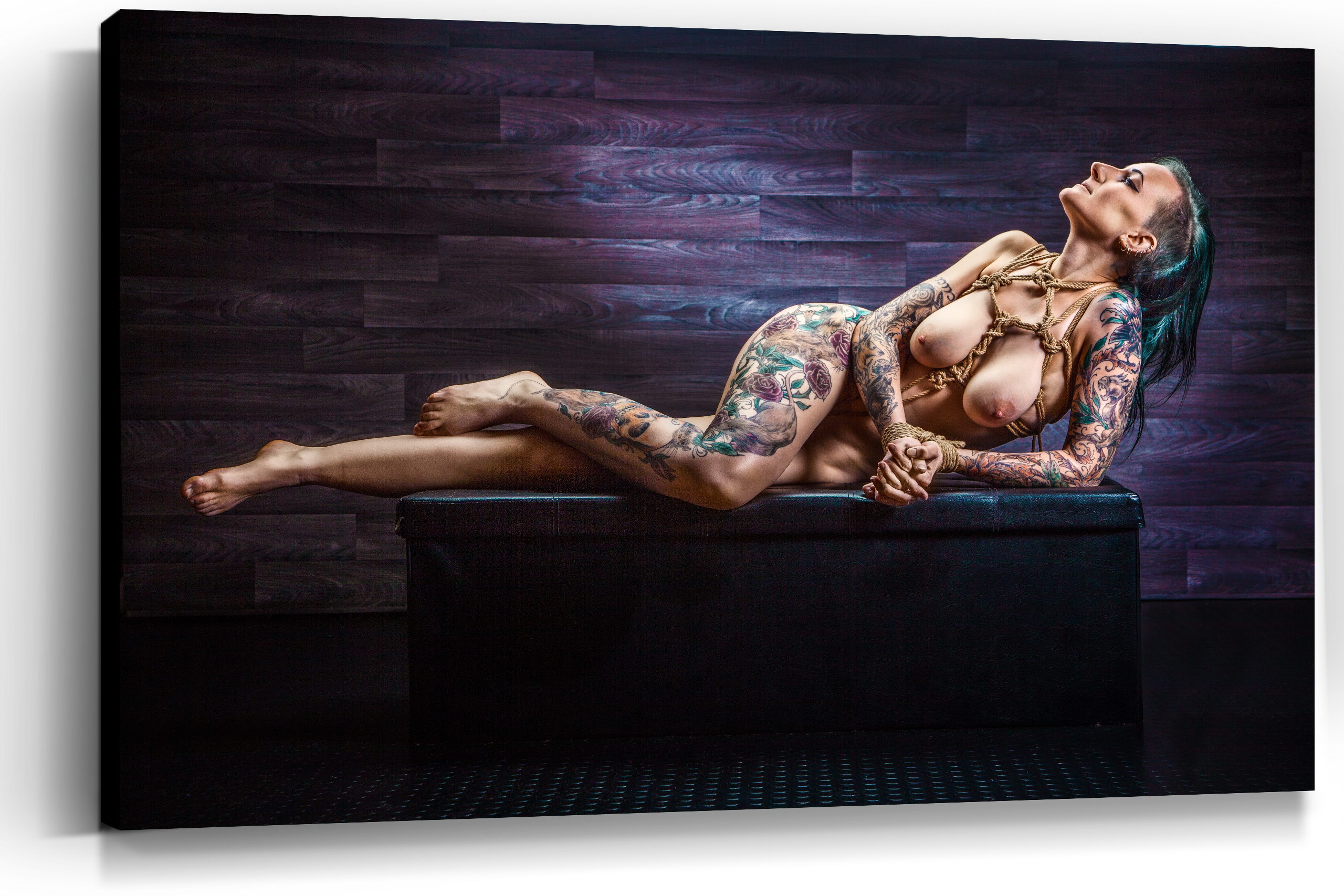 Bound Tattoo Girl - Inked girl tied in a rope harness, lying on a black bench. Canvas:... more