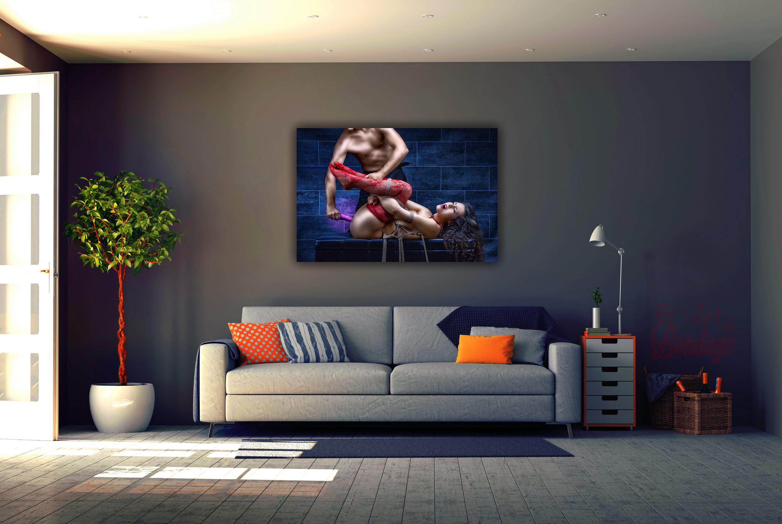The image is from the "Fine Art of Bondage" photography project. Artful photography with highly retouched images in a very colorful and high contrast.